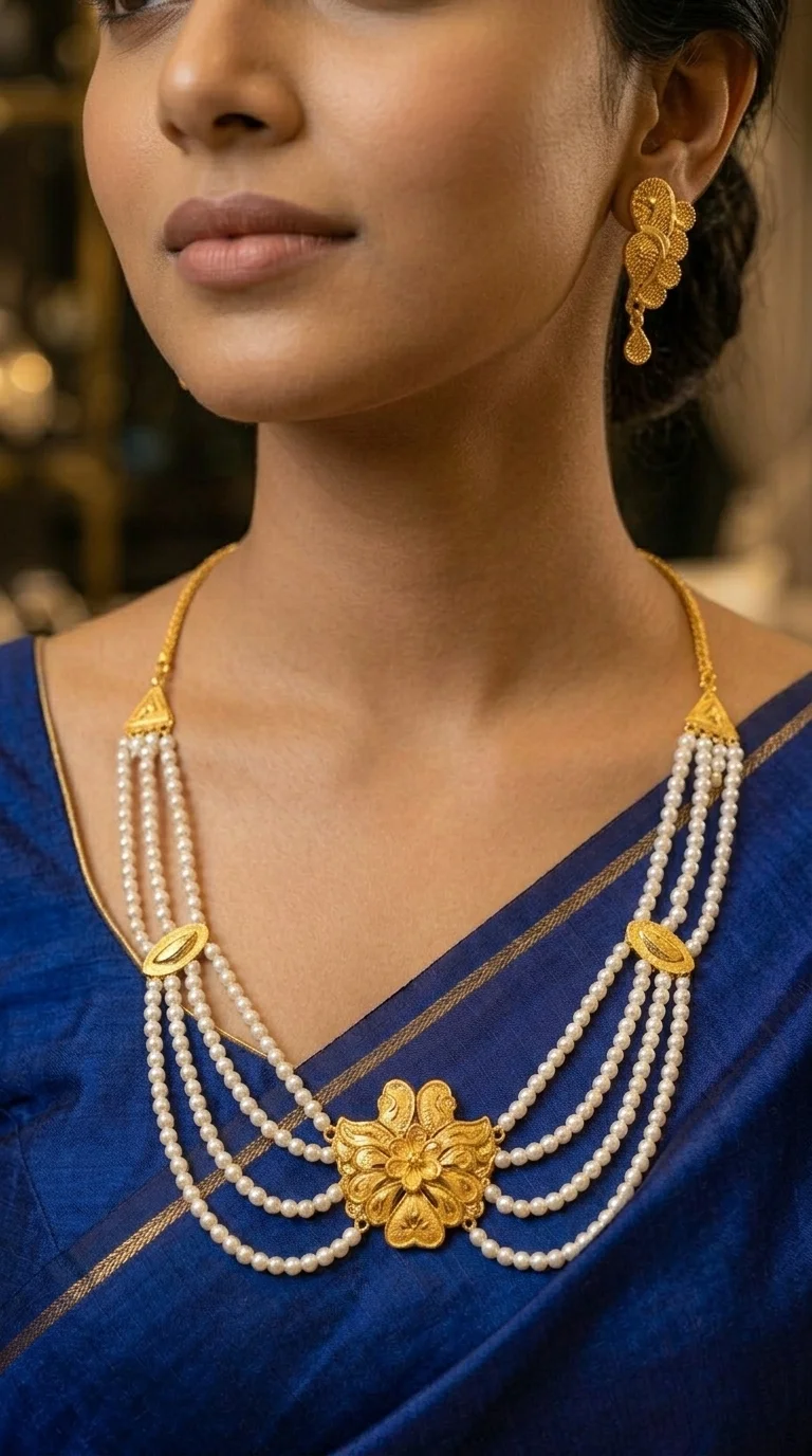 A Layered Pearl Kundan Necklace is an elegant bridal jewelry piece that blends traditional Indian craftsmanship with contemporary styling.